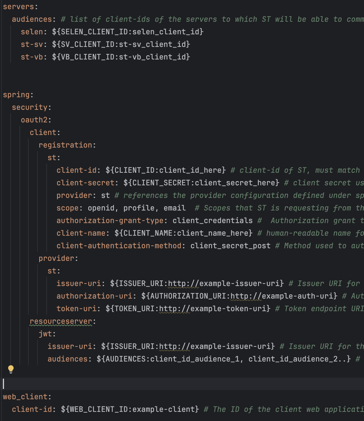 spring.security.oauth2.client.registration.st.client-secret: The client secret assigned by used IAM during client registration. -