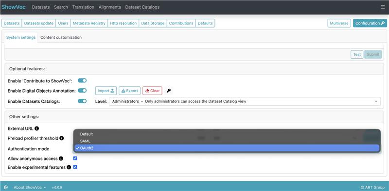In order to enable the OAuth2 authentication in the ShowVoc UI, login into the application with the administrator user and go to Administration Dashboard > Configuration. Under "Other settings" a selector allows administrator to choose between Default, SAML and Oauth2 authnetication mode.