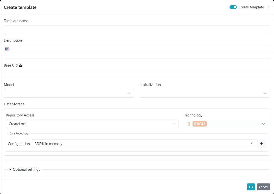 A template includes most of the information found in the dataset creation form and already explained in the previous section, such as a base URI, which in this case may represent a common base URI (or prefix) shared by multiple datasets, the data model, the lexicalization model, the data store configurations, and a subset of the optional settings.